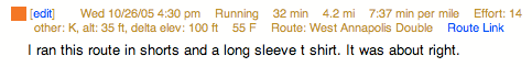 A route can be mapped and measured using the Gmap Pedometer. Gmap Pedometer can generate a URL link with the route's information encoded in it (the Permalink or tinyURL option). You may bookmark this link in your browser to recall the route's map later. Additionally, if you paste the complete URL (including the http://) into the remarks field of the route, a link to the route's map will be available in every entry using the route (see Figure 16).