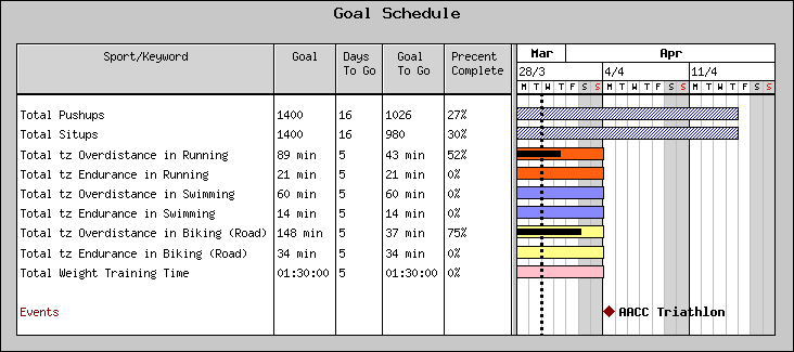 The ``Schedule'' keyword is used to store information about future races or events. The main page displays a listing of the weeks and days until upcoming events (Figure 7). These stored events can also be displayed on the view goals plot (see Figure 19).