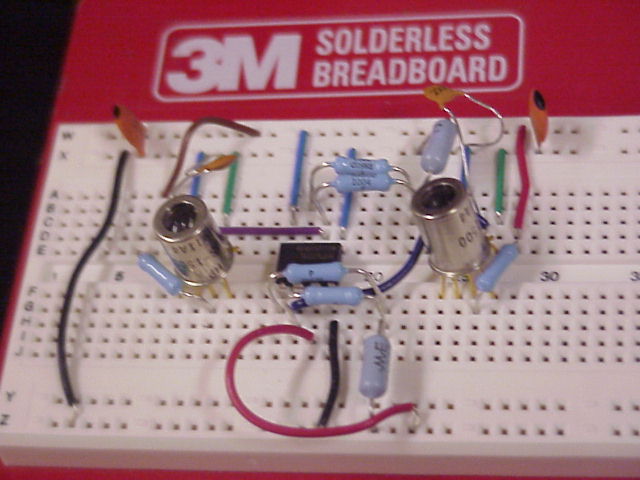 A pair of optical position sensors an test amplification circuit on a bread board.