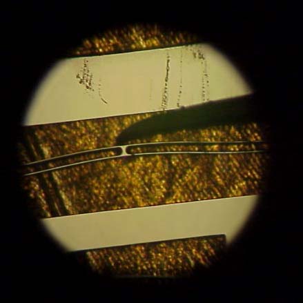 The photo of the flex tester above show some of its features. The precision stage is cut from a single sheet of aluminum. This a cheap way to give very precise and repeatable motion over small displacements. It uses optical sensors to measure both the displacement of the precision stage and the force being applied by the stage. The course X and Y stages are used to place the probe in the proper position on the wafer. The precision stage is then moved by means of a differential screw, and the force and displacement are measured and logged.